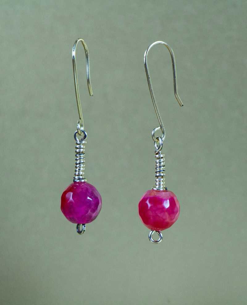 Aretes hechos a mano en alambrismo y ágata rosada.